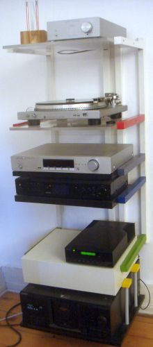 Hier sehen Sie die komplette Anlage als Wandregal. Als Lautsprecher läuft ein Päarchen Overture 2 von Zingali. Diese Boxen haben ein Mittel-Hochtonhorn, das für unglaubliche Präsenz sorgt. Wer einmal Zingalis hat, gibt sie nie wieder her... |