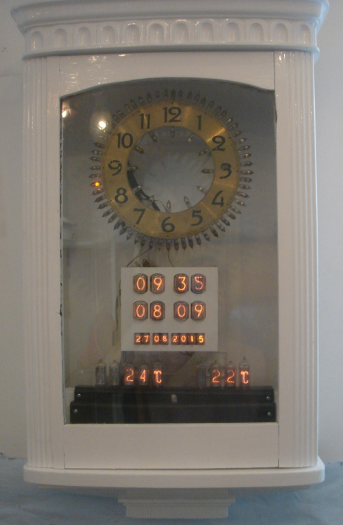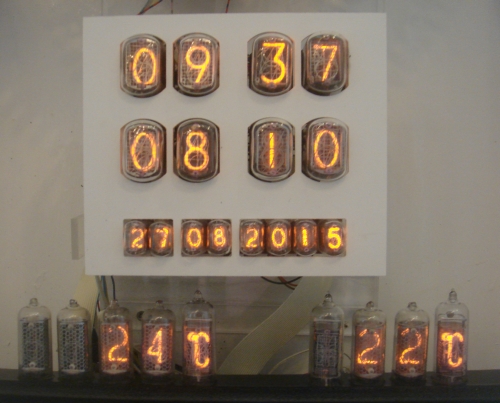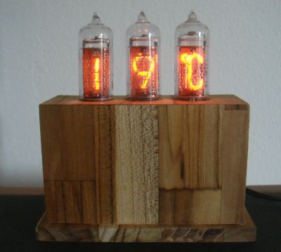Früher habe ich als Mikrokontroller die C-Control von Conrad eingesetzt. Mit der M-Unit von Conrad habe ich einige Uhren mit Nixies gebaut. Nixies waren eine der ersten Ziffernanzeigen und kamen 1957 auf den Markt. Sie sind gasgefüllte Röhren (Glimmlampen), deren Kathoden in Ziffernform gebogene Drähte sind und deren Betriebsspannung (mit Vorwiderstand!) ca. 170 Volt beträgt. Heute sind fast nur noch NOS-Bestände aus der ehemaligen UdSSR auf dem Markt. Nachdem ich auf die Arduinos gestoßen bin, baute ich die nächste Nixie-Uhr mit einem Arduino-Mega weil der so schön viele Pins hat... DCF-Nixie-Uhr Die M-Unit von Conrad hat den Vorteil, dass sie schon die ganze Logik der DCF-Uhr an Bord hat. Beim Arduino ist eigenes Programmieren angesagt. Im Netz findet man DCF-Libraries, ich habe sie nicht verwendet. Und so sieht diese Uhr aus: ![]() Zur Kontrolle ist ein LCD-Display eingebaut, das sich bei geschlossener Tür jedoch abschaltet: Es ist schließlich eine Nixie-Uhr und keine LCD-Uhr! ![]() Die Anzeige hängt von der Helligkeit ab. Bei Tag sind die Nixieröhren an und der Kranz aus Neonröhren zeigt die Sekunden an. Die obere Zeitanzeige ist die DCF-Zeit, darunter ist die "echte Ortszeit" angezeigt. Ein GPS-Empfänger ermittelt die geographische Lage, daraus wird die Ortszeit errechnet. Bei gestörtem DCF-Empfnag wird die Anzeige des Datums unterdrückt. Ganz unten wird alle 10 Sekunden im Wechsel die Innen- und Außentemperatur, Innen- und Außenfeuchte sowie der Luftdruck angezeigt. ![]() Bei Nacht sind die Nixies aus und die Stundenneons sind an. Eine äußere Neonröhre zeigt (als Stundenzeiger) die Zeit. Damit ist eine Zeitanzeige auf 12 Minuten genau möglich. ![]() Theremin Bei diesem Projekt gibt es eigentlich gar keine eigene Entwicklungsarbeit von mir. Diese Arbeit steckt im Theremin-Shield von Urs Gaudenz. Aber das Ergebnis ist ein Spaß: ![]() ![]() Im Netz findet man viele Beispiele zu Theremins, hier eines, das mir sehr gut gefällt. Modelleisenbahn Einige Arduinos habe ich auch in meiner Modelleisenbahn verbaut. Wählscheibentelefon Die Impulse der Wählscheibe werden als DTMF-Töne an eine Fritzbox weitergegeben. ![]() ![]() Sketch auf Anfrage. (Im Telefon sind Umbauten nötig.) Temperatur- und Luftfeuchte-Messgerät Ein Arduino wertet die Daten des Sensors DHT22 aus und steuert die Nixietreiber an. ![]() ![]() Geigerzähler und Umgebungsdaten Das Messgerät kann folgende Größen messen: