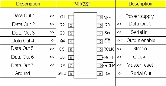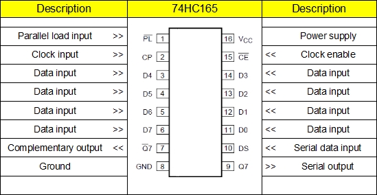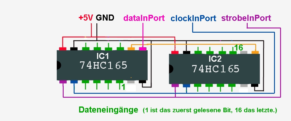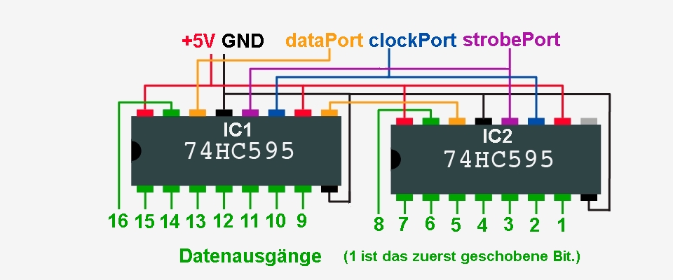 Manchmal genügen die 20 Ports eines UNO nicht. Bevor man jetzt daran denkt, einen MEGA zu benutzen (Aber vielleicht hat der MEGA immer noch zuwenig Ports.), kann man erwägen, mit Schieberegistern zusätzliche Ports zu simulieren. Braucht man zusätzliche Ausgänge, dann setzt man das IC 74HC595 ein, sind zusätzliche Eingänge nötig, verwendet man das IC 74HC165. Für beide Fälle gilt, daß man drei Ports benötigt, um 8 simulierte Ports zu erhalten. Mit einem solchen Schieberegister gewinnt man also 5 Ports. Diese Schieberegister lassen sich jedoch kaskadieren, verwendet man zwei hintereinander, gewinnt man mit drei Steuerports 13 zusätzliche simulierte Ports, jedes weitere Schieberegister fügt 8 weitere Ports hinzu. Beide Schieberegister folgen in der Pinbezeichnung der Logik "MSB first", d.h. beim 595 steht das zuerst geschobene Bit in Q7 und beim 165 wird D7 als erstes eingelesen. Es empfiehlt sich, auf der Platine jedes einzelne Schieberegister-IC mit einem 100nF Kondensator abzublocken. Für zusätzlich Ausgänge ist das IC 74HC595 geeignet. ![]() Nun zum Programm: // Die Portnummern sind beliebig byte dataPort=17; // geht an Pin 14 byte clockPort=18; // geht an Pin 11 byte strobePort=19; // geht an Pin 12 // weitere Definitionen von Variablen // .... void setup(){ pinMode(dataPort,OUTPUT); pinMode(clockPort,OUTPUT); pinMode(strobePort,OUTPUT); // weitere Ports // .... } void loop(){ // Daten und Variable bereitstellen // .... seriellOut(); } void seriellOut(){ // Die Variablennamen bit# sind nur ein Beispiel // Sie könnten auch ein Array sein und in einer for-next-Schleife ausgelesen werden digitalWrite(dataPort,bit7); clockOut(); digitalWrite(dataPort,bit6); clockOut(); digitalWrite(dataPort,bit5); clockOut(); digitalWrite(dataPort,bit4); clockOut(); digitalWrite(dataPort,bit3); clockOut(); digitalWrite(dataPort,bit2); clockOut(); digitalWrite(dataPort,bit1); clockOut(); digitalWrite(dataPort,bit0); clockOut(); digitalWrite(strobePort,HIGH); delay(1); digitalWrite(strobePort,LOW); } void clockOut(){ digitalWrite(clockPort,HIGH); delay(1); digitalWrite(clockPort,LOW); } Wird innerhalb "loop()" eine Variable geändert, so erscheint diese Änderung natürlich erst dann am Schieberegister, wenn "seriellOut()" aufgerufen wurde. In "seriellOut()" werden die Bits nacheinander auf dataPort gesetzt und mit "clockOut()" ins Schieberegister geschrieben - sie erscheinen jedoch noch nicht an den Ausgängen des Schieberegisters. Erst wenn alle Bits geschoben sind, wird über den strobePort die Information an die Ausgänge des ICs geschaltet. Sollen mehrere 74HC595 angeschlossen werden, dann werden die Pins 11 und 12 an allen Schieberegistern parallel an den Arduino angeschlossen. Der Pin 14 des folgenden ICs ist mit dem Pin 9 des vorhergehenden ICs zu verbinden. Das Programm wird bei "seriellOut()" um die weiteren Ausgabezeilen ergänzt - dabei sollte man immer jeweils 8 Ausgaben pro IC machen auch wenn man evtl. weniger Ausgänge braucht. Dann steht das zuerst geschobene Bit an Q7 des letzten ICs. ![]() ![]() ![]() Nun zum Programm: // Die Portnummern sind beliebig byte dataInPort=0; // geht an Pin 9 byte clockInPort=1; // geht an Pin 2 byte strobeInPort=2; // geht an Pin 1 // weitere Definitionen von Variablen // .... void setup(){ pinMode(dataInPort,INPUT); pinMode(clockInPort,OUTPUT); pinMode(strobeInPort,OUTPUT); // weitere Ports // .... } void loop(){ seriellIn(); // Daten und Variable bearbeiten // .... } void seriellIn(){ // Die Variablennamen bit# sind nur ein Beispiel // Sie könnten auch ein Array sein und in einer for-next-Schleife eingelesen werden digitalWrite(strobeInPin,LOW); delay(1); digitalWrite(strobeInPin,HIGH); bit7=digitalRead(dataInPin); clockIn(); bit6=digitalRead(dataInPin); clockIn(); bit5=digitalRead(dataInPin); clockIn(); bit4=digitalRead(dataInPin); clockIn(); bit3=digitalRead(dataInPin); clockIn(); bit2=digitalRead(dataInPin); clockIn(); bit1=digitalRead(dataInPin); clockIn(); bit0=digitalRead(dataInPin); //clockIn(); } void clockIn(){ digitalWrite(clockInPort,HIGH); delay(1); digitalWrite(clockInPort,LOW); } Eine Änderung an den Eingängen des ICs wird erst dann in "loop()" registriert, wenn "seriellIn()" aufgerufen worden ist, dann werden über den strobeInPort die Eingangswerte in das Schieberegister übernommen und danach mit digitalRead einzeln eingelesen. Sollen mehrere 74HC165 angeschlossen werden, dann werden die Pins 1 und 2 an allen Schieberegistern parallel an den Arduino angeschlossen. Der Pin 9 des folgenden ICs ist mit dem Pin 10 des vorhergehenden ICs zu verbinden. Das Programm wird bei "seriellIn()" um die weiteren Einlesezeilen ergänzt - dabei sollte man immer jeweils 8 digitalRead pro IC machen auch wenn man evtl. weniger Eingänge braucht. (Dann liest man eben in einen "dummy" ein.) Das zuerst eingelesene Bit ist der Eingang D7 (Pin 6) des ersten ICs. ![]() Natürlich kann man in einem Programm auch beide Porterweiterungen nutzen. Und noch etwas: Wenn hier von Arduino die Rede ist, so kann man einen Arduino UNO nehmen oder sehr viel preiswerter sich aus einem ATMega328 einen Arduino-Clone basteln. Eine andere Lösung wäre die Verwendung von Portexpander-ICs wie z.B. dem PCA9554, welches über I2C angesteuert wird. Hier erhält man mit zwei Steuerleitungen (SDA und SCL) 8 zusätzliche Ports, die wahlweise einzeln als INPUT oder OUTPUT geschaltet werden können. Die Ansteuerung ist jedoch etwas komplizierter, für das PCA9554 sind jedoch Libraries verfügbar. (In der verlinkten Library muss die I2C-Adresse in der cpp-Datei angepasst werden.) ![]() |