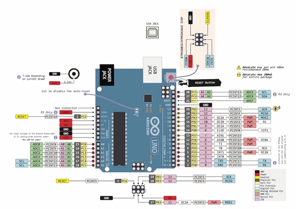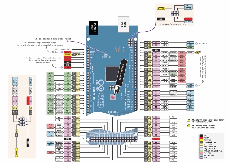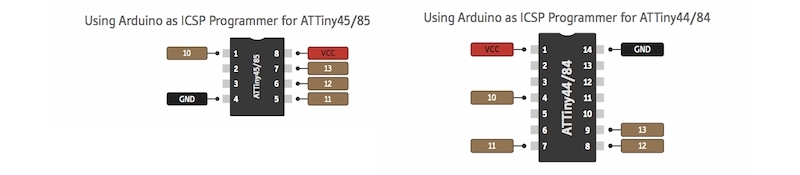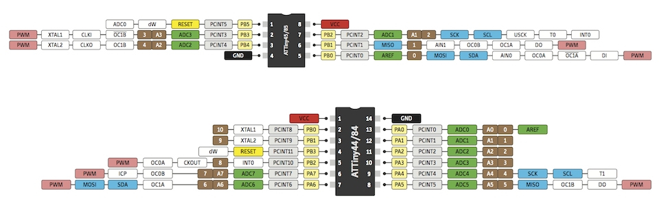 Arduino Tipps und Pinouts ATTiny Pinouts Porterweiterung Direkte Portmanipulation ESP32 Modelleisenbahn und Arduino, Anwendungen der Arduinos in der Modellbahn, ATtiny Es gibt sehr viele Einsatzmöglichkeiten für einen Arduino auf einer Modelleisenbahn. Nicht immer muss es ein "ganzer" Arduino sein, der μC mit einigen peripheren Bauteilen genügt und häufig genügt auch ein kleinerer μC z.B. ein ATtiny. Folgende Tipps finden Sie mehrmals im Netz: Um einen ATtiny einsetzen zu können, muss die Programmierumgebung des Arduino erweitert werden. Laden Sie dazu das File attiny.zip herunter und entpacken Sie es. Den Unterordner "attiny" kopieren Sie in den Ordner "hardware" der Arduinoumgebung. (Falls dieser Unterordner noch nicht existiert, erstellen Sie ihn unter dem Programmordner "arduino".) Die Ordnerstruktur sollte sein: ..>arduino>hardware>attiny und der Ordner "attiny" sollte ein File "boards.txt" und einen Ordner "variants" enthalten. Starten Sie die Arduinoumgebung neu und unter "Tools/Board" sollten die ATtiny-Einträge auftauchen. Unter der Arduino-IDE 1.6 muss die Ordnerstruktur ..>arduino>hardware>attiny>avr sein. Da die Arduino-IDE jetzt schon bei Version 1.8 angekommen ist, sind obige Tipps evtl. nicht mehr aktuell. Aktuelle Tipps finden Sie z.B. hier Eine gute aktuelle Anleitung für den ATtiny und Arduino liefert dieser Link. Damit in den ATtiny ein Programm geladen werden kann, muss ein Arduino als Programmer ausgerüstet werden. Schließen Sie dazu einen Arduino an und laden in ihn das ISP-Programm, das Sie unter "Datei/Beispiele/ArduinoISP" finden. Dann wählen Sie "Tools/Programmer/Arduino as ISP". Der Arduino ist jetzt als Programmer für ATtiny bereit. Fast: Sie müssen natürlich noch ATtiny und Arduino verbinden: siehe dazu folgende Bilder: ![]() Ein neuer ATtiny läuft mit 1MHz, für viele Anwendungen sollte er jedoch mit 8MHz getaktet werden. Wählen Sie dazu den entsprechenden ATtiny unter "Tools/Board" und danach "Tools/Bootloader installieren". Hier wird kein Bootloader installiert sondern die Fuses des ATtiny werden entsprechend gesetzt. (Dies muss nur einmal für jeden ATtiny gemacht werden.) Jetzt können Sie unter "Tools/Board" den passenden ATtiny auswählen und Ihren Sketch wie gewohnt "uploaden". Dass danach zwei Zeilen Fehlermeldungen erscheinen, ist unbedenklich. Vorher haben Sie sicher bedacht, dass die Portnummern der ATtiny sich von denen des Arduino unterscheiden und dass die Portnummern nicht gleich den Pinnummern sind. Folgende Bilder können Ihnen dabei helfen: ![]() ![]() ![]() Pinout des Arduino Uno: ![]() Pinout des Arduino Mega: ![]() ![]() |