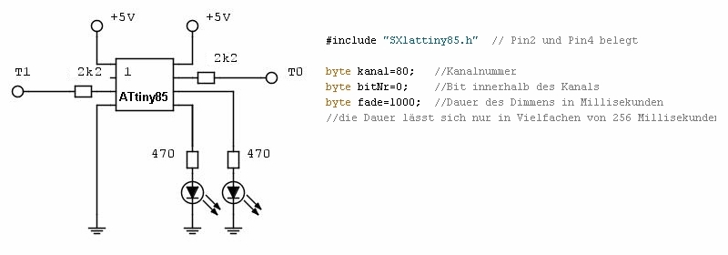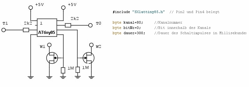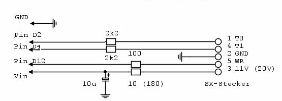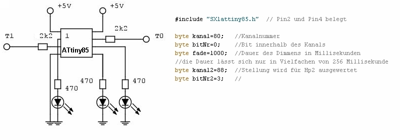 Selectrix-Selbstbaudekoder Modelleisenbahn und Arduino, Anwendungen der Arduinos in der Modellbahn, ATtiny Diese Dekoder sind für den SX-Bus gedacht. Je nach μC ist eine etwas andere Library SX nötig. (Downloads am Ende der Seite.) Die ATmega328 und der ArduinoMega benötigen die SX1 Library, die ATtiny84/85 benötigen die SX1attiny84 bzw. SX1attiny85 Library. Beim ATmega328 liegt der Takt T0 an Digitalport 2 und das Signal T1 an Digitalport 4, der Rückkanal liegt auf Digitalport 12. Beim ArduinoMega liegt T0 und T1 wie beim ATmega328, der Rückkanal jedoch auf Digitalport 10. (Wird kein Rückkanal benötigt, kann anstatt der Library SX1 die Library SX1r [r wie readOnly] benutzt werden, dann ist der Pin für den Rückkanal für beliebige Zwecke frei.) Für den ATtiny84 liegt der Takt T0 an Digitalport 8 und das Signal T1 an Digitalport 9. Beim ATtiny85 liegen Takt T0 auf Digitalport 2 und Signal T1 auf Digitalport 4. Die Libraries für ATtiny können nur lesen, zum Schreiben sind sie bei 8MHz zu langsam - zumindest mit den hier verwendeten Libraries. Die benötigte Interface-Hardware ist hier beschrieben, wobei auch folgende einfache Schaltung funktioniert: ![]() Bei sämtlichen Schaltungen ist der μC direkt an den Anschlüssen der Versorgungsspannung mit einem Kondensator von einigen 100 nF abzublocken. ![]() Dekoder für eine WeicheVerwendet wird ein ATtiny85, der an seinen Digitalports 0 und 1 einen Impuls zum Stellen der Magnetartikel (Weiche oder Formsignal) abgibt. Der Kanal und das Bit des Magnetartikels wird beim Programmieren des ATtiny festgelegt, Sie müssen dazu im Sketch die Variablen "kanal" und "bitNr" anpassen. Die Variable "dauer" legt die Impulsdauer in Millisekunden fest.Hier das Schaltbild und ein Auszug aus dem Sketch: ![]() Den Sketch finden Sie hier. (Natürlich können anstatt FETs auch NPNs zum Schalten verwendet werden.) ![]() Dekoder für ein LichtsignalDas Prinzip ist wie beim Dekoder für eine Weiche, nur ist es noch einfacher, da die Treibertransistoren entfallen, der ATtiny kann direkt über Vorwiderstände die LEDs des Signals treiben. Die Variablen "kanal" und "bitNr" werden wie oben beim Programmieren festgelegt, die Variable "fade" legt die Überblenddauer fest.Hier das Schaltbild und ein Auszug aus dem Sketch: ![]() Den Sketch finden Sie hier. Bei Bedarf kann auch Hp0, Hp1 und Hp2 dargestellt werden. Dabei kann zwischen Hp1 und Hp2 z.B. aufgrund einer Weichenstellung umgeschaltet werden. (Die Weichenstellungen sind über den SX-Bus ja verfügbar.) In folgendem Beispiel ist angenommen, dass auf Hp2 umgeschaltet wird, wenn Weiche 88/3 (Kanal88, Bit3) auf gebogen (1) steht. Hier das Schaltbild und ein Auszug aus dem Sketch: ![]() Den Sketch finden Sie hier. ![]() Dekoder für mehrere WeichenJe nachdem wieviel Ausgangsports benötigt werden, wird man auf den ATmega328 oder den ATtiny84 zurückgreifen. Die Programmierung geschieht analog den obigen Beispielen, wobei in einem Dekoder auch Magnetartikel und Lichtsignale gemischt werden können.Natürlich ist das Schalten nicht auf Weichen und Signale beschränkt, hier sind der Phantasie keine Grenzen gesetzt, mit entsprechenden Libraries können auch Servos angesteuert werden. ![]() Download der LibrariesSX1, SX1attiny85, SX1attiny84![]() |