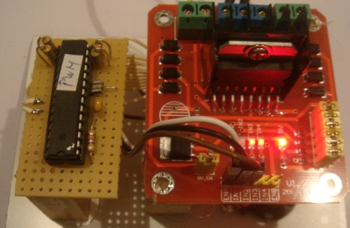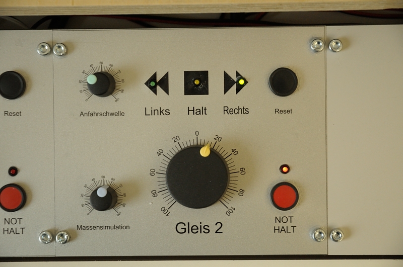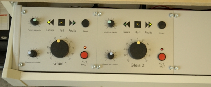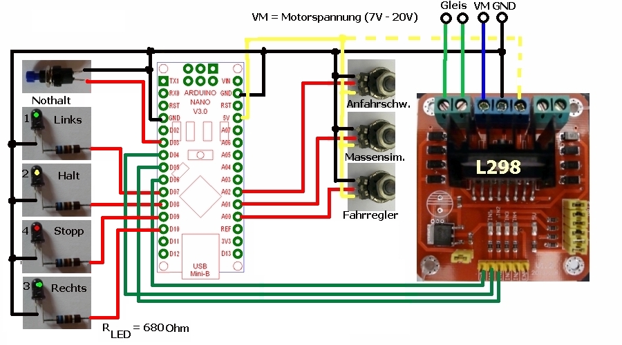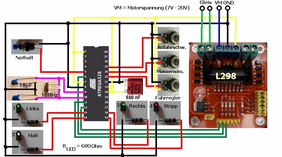 Arduino/Fahrregler analog Download Analog PWM: Mit einem Arduino (bzw. einem ATmega328) und einer H-Brücke kann ein Fahrregler gebaut werden, der relativ feinfühlige Langsamfahrt erlaubt und dessen Regler sowohl Geschwindigkeit und Richtung einstellt: Nach links drehen - Rückwärtsfahrt, nach rechts drehen - Vorwärtsfahrt. Weiter ist eine Massensimulation einstellbar, sowie die Anfahrschwelle. Die Regelkurve ist nicht linear, so dass im langsamen Bereich feinfühlig geregelt und im schnelleren Bereich zügig beschleunigt werden kann: Noch bessere Ergebnisse würde man erhalten, wenn man wie bei Digitaldecodern üblich die GegenEMK des Motors messen und zur Regelung nutzen würde, dann entfiele auch der Einsteller der Anfahrschwelle. Das macht z.B. Jeremy Brandon mit seinem DeLuxe-Fahrregler, der über Joerger (dort etwas nach unten scollen..) vertrieben wird. (Das Ganze funktioniert aber nur, wenn nur eine Lok - möglichst ohne beleuchtete Wagen - gesteuert wird.) Die H-Brücke mit dem L298 wurde fertig gekauft. (Eigentlich kann man mit ihr zwei Motoren steuern...) China liefert fertige Boards fast zu dem Preis, der hierzulande für das IC verlangt wird. (Bei Ebay nach L298 suchen.) Die H-Brücke erhält man für ca. 4€, den 328 mit Bootloader für ca. 3€ (z.B. im Guloshop), so dass man für ca.10€ plus Material aus der Bastelkiste sich diesen Fahrregler bauen kann. (Je nachdem, was in der Bastelkiste fehlt, kommt der Regler auch auf bis zu 20€.) In der endgültigen Version wird der ATmega328 vom Arduinoboard abgezogen und auf eine eigene Lochrasterplatine mit Oszillator gesetzt: ![]() ![]() Hier das Schaltbild: ![]() (Die Potiwerte 10k und 100k waren zufällig vorhanden, es gehen alle Werte von 4k7 bis 100k. Einzige Bedingung: Linear sollten sie sein.) Ein Arduino Nano ist fast so billig geworden wie ein ATMega328 mit Bootloader plus Quartz, so daß es sich anbietet, direkt einen Nano zu nehmen. Für diesen Fall folgt hier das Schaltbild: ![]() Die Stromversorgung der H-Brücke reicht von 5V bis 36V, so dass der Regler an praktisch alle Bedürfnisse und Spuren angepasst werden kann. Er wurde mit 5V-Versorgung mit Spur T getestet, mit 10V-Versorgung mit Spur Z, sowie mit 16V-Versorgung mit Spur N und Spur H0. Die H-Brücke ist zwar kurzschlussfest, mit dem relativ kleinen Kühlkörper erwärmt sie sich im Kurzschlussfall jedoch kräftig, so dass sie nicht dauerkurzschlussfest ist. Einstellen der Massensimulation und der Anfahrschwelle: Massensimulation: je nach Belieben...(Bei hohen Werten ist Ihr Eisenbahnergeschick gefordert..) Anfahrschwelle : Fahrregler so stellen, dass soeben in eine Richtung gefahren wird (niedrigste Fahrstufe). Dann den Regler Anfahrschwelle soweit aufdrehen, dass die Lok gerade eben anfährt. Ein Nachteil soll jedoch nicht verschwiegen werden: aufgrund der PWM-Frequenz von ca. 1kHz ist beim Anfahren bei einigen Loks ein "Singen" zu hören. Die PWM-Frequenz läßt sich aber vor dem Brennen ändern, es müssen dazu im Setup bei der gewünschten Einstellung die Kommentarzeichen entfernt werden. Unter anderen hat Herr Repin diesen Regler nachgebaut, hier zwei Fotos: ![]() ![]() Von ihm stammt auch der Tipp, daß man die Leitungen zum Gleis verdrillen sollte. Download des Sketch. Es gibt auch eine Weiterentwicklung, den Universalregler. Fahrregler ohne Arduino finden Sie hier. ![]() |
