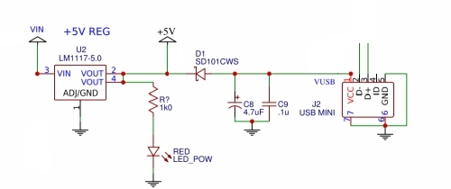 Die Stromversorgung des Nano ist etwas einfacher. Die 5V des USB-Anschluß sind mit einer Diode vom 5V-Regler des Vin entkoppelt.