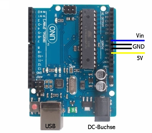 Der Arduino UNO kann auf vier Arten mit Strom versorgt werden: