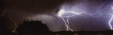 ![]() Wenn elektrische Ladungen sich ausgleichen, entstehen Funken oder Blitze. Durch Aufwinde in der Gewitterwolke und die ungleiche Verteilung von Eis und Wasser in der Wolke, werden die Ladungen getrennt. Der obere Teil der Gewitterwolke ist normalerweise positiv geladen und der untere negativ. Wenn die Spannung zwischen den verschiedenen Ladungen zu gross wird, kommt es zu einem Blitz. Entweder erfolgt ein Ladungsausgleich innerhalb der Wolke oder zwischen dem Erdboden und dem unteren Teil der Wolke. In seltenen Fällen kann es auch zu einem positiven Blitz zwischen dem oberen Teil der Wolke und dem Erdboden kommen. Für Blitze zwischen Wolke und Erde muss der Spannungsunterschied mehr als 100 Millionen Volt betragen. Beim Blitz wird um den Entladungskanal die Luft schlagartig auf ca. 40000°C erhitzt. Dies führt zu einer sehr schnellen Ausdehnung der Luft, wodurch der Donner hervorgerufen wird.  |