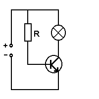 Die Grundschaltung eines Transistors ist folgende:![]() Gehen Sie mit der Maus auf den fett gedruckten Text. Wenn bei einem Transistor kein Basisstrom fließt, dann kann auch kein Kollektorstrom fliessen. Fließt jedoch Basisstrom (grün) , dann fließt auch Kollektorstrom (rot). Dabei kann der Kollektorstrom sehr viel größer als der Basisstrom sein. Beim Transistor fließt also nur dann Kollektorstrom, wenn Basisstrom fließt. Damit läßt sich der Transistor als stromgesteuerter Schalter einsetzen: Nur wenn der Widerstand R (genügend) Strom fliessen läßt, fließt auch Kollektorstrom und die Lampe leuchtet. Eine Anwendung wäre, den Widerstand R durch einen lichtabhängigen Widerstand (LDR) zu ersetzen, dann würde die Lampe abhängig von der Helligkeit an- oder ausgehen.  |