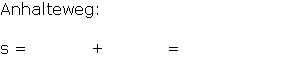 Der AnhaltewegDer Anhalteweg bei einem Bremsvorgang setzt sich aus Reaktionsweg und Bremsweg zusammen. Während der Reaktionszeit legt das Fahrzeug ungebremst mit gleichförmiger Geschwindigkeit den Reaktionsweg zurück. Erst nach der Reaktionszeit setzt der Bremsvorgang ein, der sich mit den Formeln der gleichförmig beschleunigten Bewegung berechnet. Berechnen Sie den Anhalteweg für ein Auto, das aus der Geschwindigkeit 50km/h eine Vollbremsung mit der Verzögerung 8m/s² macht. Für die Reaktionszeit werden 0,9s angenommen! Welche Bremskraft ist nötig, wenn das Auto eine Masse von 1,2t hat? Wenn Sie mit der Maus auf den Lösungsansatz gehen, wird die Lösung - dauerhaft - gezeigt. ![]() ![]() ![]() ![]() Beachten Sie im Straßenverkehr, dass bei doppelter Geschwindigkeit und sonst gleichen Bedingungen der Reaktionsweg sich verdoppelt (=25m), der Bremsweg sich aber vervierfacht (=48,4m) und der Anhalteweg somit auf 73,4m steigt! |
