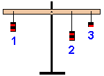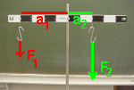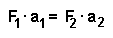 Greifen mehrere Kräfte an, muß man anders argumentieren: Die Kräfte 2 und 3 drehen in die gleiche Richtung. Also müssen die Drehwirkungen (=Drehmomente) der Kräfte 2 und 3 zusammen so groß wie das Drehmoment der Kraft 1 sein. Das Drehmoment berechnet sich als "Kraft mal Abstand", also F·a. Für nebenstehendes Beispiel gilt somit: ![]() |