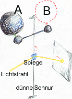 Wird die größere Masse von Position A in Position B verschoben, dann wandert der Lichtfleck an der Wand. Zwischen der größeren Masse und den beiden kleineren Massen müssen also Kräfte wirken. |