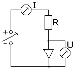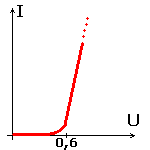 Erhöht man in nebenstehender Schaltung die Spannung langsam von 0V an, dann bemerkt man, dass unterhalb von ca. 0,6V kein Strom fliesst. Ab dieser "Schwellspannung" steigt die Stromstärke stark an. |