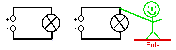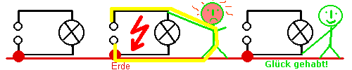 Auf der anderen Seite ist die "Erde" sehr wohl von Bedeutung: Alle Körper auf der Erde sind mit ihr mehr oder weniger gut leitend verbunden. Bei manchen Stromkreisen ist sogar ein Pol mit Absicht sehr gut leitend mit der Erde verbunden. Bei unserer Stromversorgung ist ein Anschluss der Steckdose (mit Absicht!) mit der Erde verbunden! (Dies ist keine physikalische Notwendigkeit, sondern eine technische.) Dies hat zur Folge, dass wir alle immer an einen Anschluss der Steckdose (mehr oder weniger gut leitend) angeschlossen sind! ![]() Jetzt genügt natürlich die Berührung mit einem Pol für Stromfluss. An der Steckdose ist nur ein Anschluss gefährlich, mit dem nicht gefährlichen sind wir ja sowieso verbunden. |
