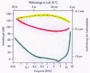 |   | Das Ohr ist nicht für alle Töne gleich empfindlich: Wie zu erwarten ist es im Bereich der Sprache und der natürlichen Umweltgeräusche besonders empfindlich. Bei sehr tiefen oder sehr hohen Tönen nimmt die Empfindlichkeit stark ab. Das Diagramm nebenan zeigt in der grünen Linie die Hörschwelle. (Wobei das Ohr erstaunlich leistungsfähig ist, im empfindlichsten Bereich ist nicht mal die Bewegung eines Moleküldurchmessers nötig, um einen Höreindruck hervorzurufen.) Die rote Linie zeigt den Schalldruck an, bei dem das Ohr Schaden nimmt. Die gelbe Linie zeigt den Schallduck, bei dem das Ohr schmerzt. Hier sieht man einen fatalen "Fehler" der Evolution: Das Gehör nimmt schon Schaden bevor es weh tut! Das sollte man beim Hören von Musik beachten. (Mit Kopfhörern ist durchaus ein Schalldruck zu erreichen, der das Ohr schädigen kann!) |