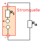 Die Elektronen erhalten von der Stromquelle eine bestimmte Energie (abhängig von der Spannung der Stromquelle). Auf ihrem Weg im Stromkreis geben die Elektronen an jedem Hindernis (=Widerstand) einen Teil ihrer Energie ab. Den Energieverlust der Elektronen gibt der "Spannungsabfall" am Widerstand an. Er berechnet sich nach der bekannten URI-Formel. Da der Strom ja auch durch die Stromquelle (=Batterie) fliessen muss, findet auch am Innenwiderstand der Stromquelle ein Spannungsabfall statt. Deswegen sinkt die Klemmenspannung einer Stromquelle bei Belastung mit einem Strom. Beispiel 1: Eine Batteriezelle mit U=1,5V hat den Innenwiderstand Ri=5 Ohm. Diese Batterie wird kurzgeschlossen (Ra=0 Ohm). Welche Kurzschluss-Stromstärke fliesst? I=U/R=1,5V/5 Ohm = 0,3A. Beim Kurzschluss ist die Klemmenspannung 0V und es fliessen 0,3A. Beispiel 2: Eine Batteriezelle mit U=1,5V hat den Innenwiderstand Ri=5 Ohm. Der Widerstand Ra ist 10 Ohm. Es liegt eine Reihenschaltung von Ri und Ra vor. Der Gesamtwiderstand ist 15 Ohm. Bei 1,5V fliesst also die Stromstärke I=U/R=1,5V/15 Ohm=0,1A. Bei dieser Stromstärke fällt am Innenwiderstand Ri die Spannung U=R·I=5 Ohm·0,1A=0,5V ab. Die Klemmenspannung der Batterie beträgt somit nur 1V. Bei Belastung mit Ra=10 Ohm ist die Klemmenspannung dieser Batterie nur noch 1V und es fliesst die Stromstärke 0,1A. |