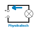 Man unterscheidet zwischen technischer und physikalischer Stromrichtung. In Wirklichkeit bewegen sich in den Kabeln die negativen Ladungen (=Elektronen), die positiven Ladungen sind in einem Festkörper nicht beweglich. In der Grafik bewegen sich die negativen Ladungen von rechts nach links.