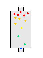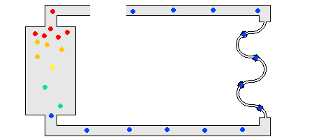 Eine Stromquelle (Z.B. eine Batterie) treibt in ihrem Inneren die Ladungen an auch wenn kein Stromkreis angeschlossen ist. Die Stromquelle erzeugt eine Spannung. Die Spannung wird mit dem Buchstaben U abgekürzt und mit V (=Volt) gemessen. Wenn die Batterie leer ist oder die Stromquelle keine Spannung erzeugt, sieht die Sache so (Maus hier drauf!) aus. (In der Grafik soll die Farbe der Ladungsteilchen deren Energie angeben: blau = wenig Energie, rot = viel Energie.) |