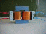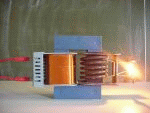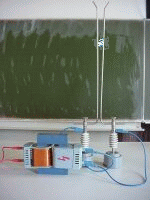 Dies kann man benutzen, um hohe Spannungen zu erzeugen: Wir schliessen die Primärspule mit 600 Windungen an die Steckdose mit 230V Spannung an. Als Sekundärspule nehmen wir eine Spule mit 12000 Windungen, das sind 20-mal mehr Windungen. Also wird die Spannung an der Sekundärspule auch 20-mal so gross werden: 20 mal 230V sind 4600V! Das Ergebnis zeigt nebenstehendes Foto. |