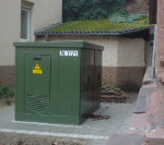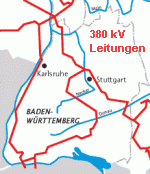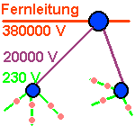 Für den Betrieb des Verbundsystems sind Transformatoren sehr wichtig. Nebenstehende Fotos zeigen Transformatoren eines Umspannwerks (Hier wird von der sehr hohen Spannung der Fernleitung auf eine mittlere Spannungsebene für regionale Verteilung transformiert.) und die Transformatorstation direkt hinter unserer Schule (Hier werden die mittleren Spannungen auf den Wert 230 V transformiert.). Da Transformatoren nur bei sich ändernden Strömen funktionieren, ist unsere Stromversorgung mit Wechselspannung aufgebaut. Genauer: unsere Stromversorgung arbeitet mit Drehstrom, das sind drei zeitlich gegeneinander versetzte Wechselströme. Eine andere Technik bei Fernleitungen ist HGÜ (HochspannungsGleichstromÜbertragung). Dazu wird bei der Einspeisung der hochvoltige Wechselstrom in Gleichstrom umgewandelt und beim Abnehmer aus dem Gleichstrom wieder Wechselstrom gemacht. Der Sinn dieses Vorgehens ist, daß man bei gleicher Isolatortechnik eine höhere Spannung einsetzen kann. Bei einer 380000 V - Leitung treten Spitzenspannungen von 540000 V auf, d.h. die Isolation der Leitung muss für 540000 V ausgelegt sein obwohl der Effektivwert nur 380000 V beträgt. Betreibt man die so isolierte Leitung jedoch mit Gleichstrom, kann dieser eine Spannung von 540000 V haben, was die Übertragungskapazität der Leitung um den Faktor 1,4 erhöht. Zusätzlich geht bei Wechselstrom Energie durch Strahlung verloren, was bei Gleichstrom entfällt. |
