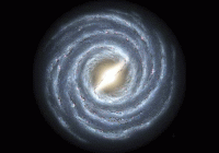Unsere Sonne gehört zu einer Ansammlung von ca. 100 Milliarden Sternen, die unsere Milchstraße bilden. (Im Bild nebenan siehst du, wie unsere Milchstraße aus dem fernen Weltall aussehen würde.) Der Durchmesser der Milchstraße beträgt ca. 100000 Lichtjahre und unser Sonnensystem ist ca. 28000 Lichtjahre vom Zentrum entfernt. Du kannst dir jetzt einen Maßstab ausdenken, dass die Milchstraße auf ein Blatt Papier passt und die Lage unseres Sonnensystems einzeichnen. Wenn du versuchen willst, die Sonne einzuzeichnen, musst du berücksichtigen, dass ein Atom ungefähr 0,00000001 cm groß ist. Und weniger als ein Atom Farbe kannst du wirklich nicht aufs Papier bringen. |