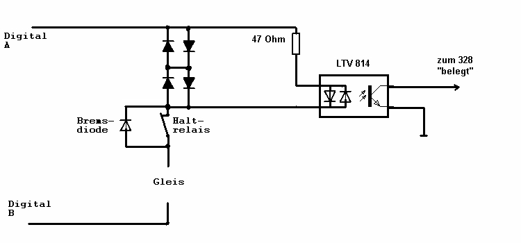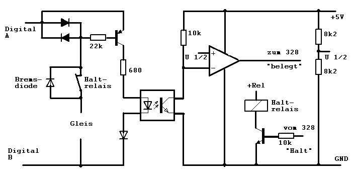Die Belegtmelder sind als Stromfühler ausgeführt. Zwei antiparalle Dioden sorgen für einen Spannungsabfall, welcher über den Transistor den Optokoppler ansteuert, der über den Opamp das Signal an einen Arduino weitergibt, der die Ankopplung an den SX-Bus vornimmt.