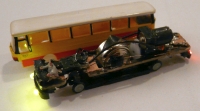 Für Licht im Bus des Z-Car-Systems ist etwas Elektronik nötig, da die LED eine höhere Spannung benötigt als die Batterie liefert. Die kleine Schaltung mit dem PR4401 macht das. Von Oliver alias
