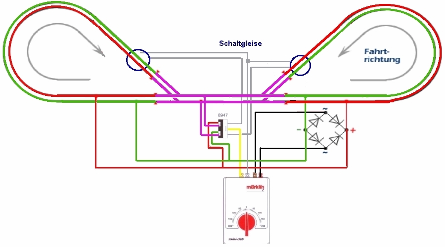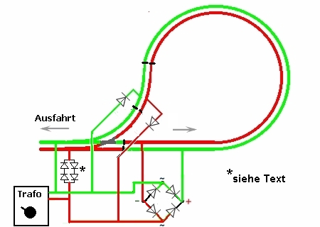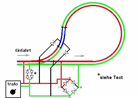 Im Analogbetrieb ist die Sache komplizierter. Will man die Kehrschleife jedoch nur in einer Richtung durchfahren, genügen 6 Dioden (oder 2 Dioden und ein Brückengleichrichter). (Da im Analogbetrieb nach dem Durchfahren der Kehrschleife die Anlage ja "andersrum" befahren wird, ist nur ein Zug im Stromkreis sinnvoll - der andere würde ja ebenfalls seine Richtung ändern.) ![]() ![]() Im linken Bild fährt der Zug ein. Er bleibt im blauen Bereich stehen, da die Dioden sperren. Jetzt wird der Trafo umgepolt - der Zug fährt ja auch in die andere Richtung! - die Dioden leiten jetzt und der Zug fährt aus der Kehrschleife heraus, rechtes Bild. Der Brückengleichrichter (oder 4 Dioden) sorgt dafür, daß die Kehrschleife unabhängig von der Trafostellung immer in der gleichen Richtung durchfahren wird. Das bedeutet, daß die Kehrschleife ohne Halt durchfahren werden kann, wenn während der Fahrt durch die Kehrschleife (vor dem blauen Teil) die Fahrspannung umgepolt wird. Wird diese Funktion nicht benötigt, dann können bei der Brückenschaltung die beiden Dioden weggelassen werden, die im linken Bild nicht leiten. Dies entspräche dann der Schaltung von Märklin (8993). Durch die Dioden liegt die Spannung in der Kehrschleife um ca. 1,4V unter der Spannung der restlichen Anlage. Falls der Spannungssprung stört, kann man in die Zuleitung der restlichen Anlage 4 Dioden einbauen, jeweils 2 antiparallel - mit * markiert. Andererseits kann man die gesamte Schaltung auch mit Schottky-Dioden aufbauen, die eine deutlich niedrigere Schwellspannung haben, so daß der Spannungsabfall nicht mehr stört, dann können die mit * markierten Dioden entfallen. Auf jeden Fall ist die Strombelastbarkeit der Dioden so zu wählen, daß sie den Kurzschlußstrom des Fahrgeräts aushalten. Märklin beschreibt in seinem Gleisanlagenbuch (Download) auf Seite 39 eine Schaltung ganz ohne Dioden unter Verwendung ihres Schaltgleises und Fernschalters. Auch hier - wie bei allen Lösungen durch Umpolen der Fahrspannung - geht die Zuordnung Trafostellung/Fahrtrichtung verloren. Erweitert man diese Schaltung etwas, erhält man folgende Lösung: ![]() Anstatt der Märklin-Schaltgleisen kann man natürlich auch alle anderen möglichen Melder wie Lichtschranken/Hallsensoren/usw. einsetzen. Ebenso kann statt des Märklin-Umschalters 8947 ein beliebiges bistabiles Relais mit zwei Umschaltkontakten verwendet werden. Die violett gezeichnete Strecke kann natürlich auch Ausweichgleise usw. enthalten. Zu beachten ist aber, daß sinnvollerweise nur ein Zug unterwegs sein kann und daß sich die Fahrtrichtung mit dem Trafo nicht mehr ändern lässt. Zum Ändern der Fahrtrichtung auf der violetten Strecke müssen Taster parallel zu den Schaltgleisen verwendet werden. (Anstatt des Märklin-Trafos kann selbstverständlich auch ein Selbstbau-Fahrregler verwendet werden, dann ist auch der Gleichrichter u.U. nicht mehr nötig.) |