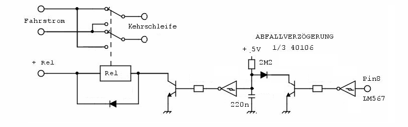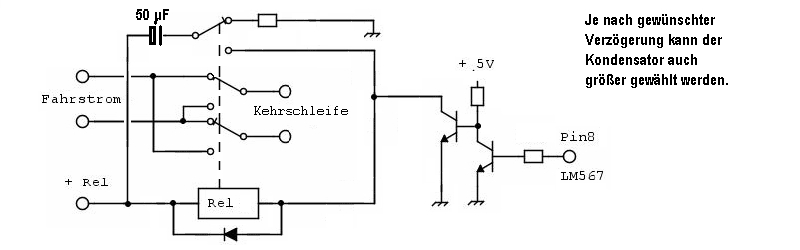 Modelleisenbahn in Spur Z (Spurweite 6,5mm, Maßstab 1:220). Infos zur Modellbahn, Tipps zur Eisenbahn, Links zu Modellbahnseiten, Videos zur Modelleisenbahn Spur Z. Kehrschleifen Digital Analog Im Digitalbetrieb sind Kehrschleifen kein großes Problem, es ist egal, wie der Digitalstrom gepolt ist. Die Kehrschleife muss nur so lang sein, daß der längste Zug ganz hineinpasst. Weiter muss die Kehrschleife an beiden Enden zweischienig vom Rest der Anlage getrennt sein. An der Unterbrechungstelle, an der ein Kurzschluss auftreten würde, ist eine Reflexlichtschranke zwischen den Schienen montiert: ![]() (Hier noch nicht eingeschottert.) ![]() Wem eine Reflexlichtschranke zu unsicher ist, der kann mit IR-Diode und Fototransistor auch eine gewöhnliche Lichtschranke aufbauen. Dann entfällt aber in der Abfallverzögerung der erste Inverter, da eine Reflexlichtschranke im Ruhezustand unterbrochen ist, eine gewöhnliche Lichtschranke jedoch bei Aktivierung unterbrochen ist. Obige Idee kann auch im Analogbetrieb benutzt werden, dann muss aber gleichzeitig mit der Kehrschleife auch das Fahrgerät umgeschaltet werden (und umgepolt bleiben) - was wohl nur bei Eigenbauten geht. In diesem Fall ist die Kehrschleife auch nur in einer Richtung durchfahrbar. Eine weitere mögliche Schaltung wäre diese: ![]() |