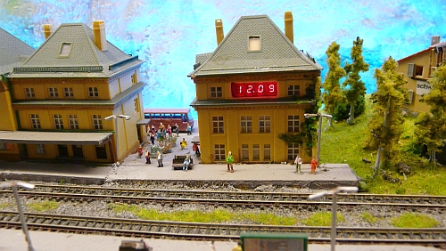Im Nebengebäude des Bahnhofs läuft eine (Modell-)Uhr. Ein Tag dauert dabei ca.30 Minuten. Die Zeit wird auf den SX-Bus geschrieben, so kann überall tagesabhängig die Beleuchtung gesteuert werden.