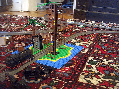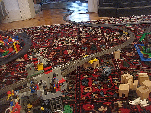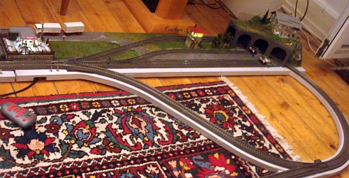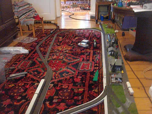 Begonnen wurde mit einem kleinen Brett und etwas C-Gleis. Dann wurden rechts und links Segmente gebaut, mit denen etwas einfacher auf den Teppich gefahren werden kann.