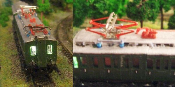 Stromabnehmer und Dachverkabelung werden montiert, mit kleinen Lichtleitern werden die Stirnlampen nachempfunden.
