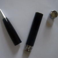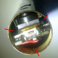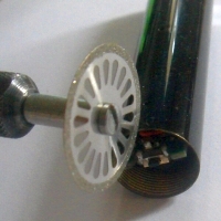 Zunächst wird der Kugelschreiber so weit es geht auseinandergeschraubt. Dann wird seitlich mit einer kleinen Trennscheibe die Hülse aufgetrennt. Dies muss sehr vorsichtig geschehen, denn wenn man die Platine oder den Akku triff, kann man aufhören und das Teil entsorgen...