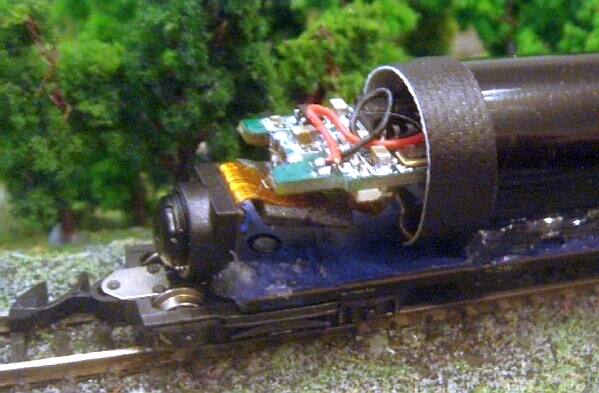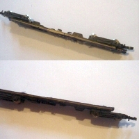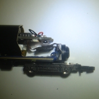 Jetzt kommt der unangenehmste Teil, man muss einen Wagen opfern. Ich hatte einen alten Rheingoldwagen, bei diesem habe ich den Wagenkasten abgesägt. Auf das Untergestell wird das Kameragehäuse geklebt und nach Justierung die Kamera mit etwas Kleber fixiert.